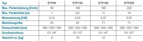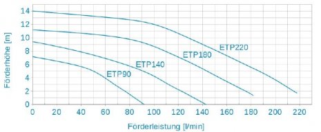 WUFLEX-Eintauchpumpen sind in der leistungsstarken Standardausführung in vier optimal aufeinander abgestimmten Baugrößen (ETP90, ETP140, ETP180, ETP220) erhältlich. Alle Pumpengrößen basieren auf dem gleichen Baukastenprinzip und unterscheiden sich nur durch unterschiedliche Abmessungen. Die Leistungsgröße der Motoren und die Pumpenlaufräder lassen sich so leicht an die jeweilige Förderaufgabe anpassen. Die tatsächliche Fördermenge ist abhängig von der Förderaufgabe sowie dem Medium und stellt sich entsprechend der Förderhöhe ein. Bei der Auswahl der geeigneten WUFLEX-Eintauchpumpe und Motorenleistung unterstützen wir Sie gerne.